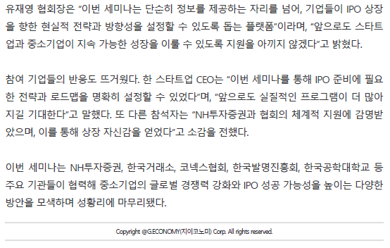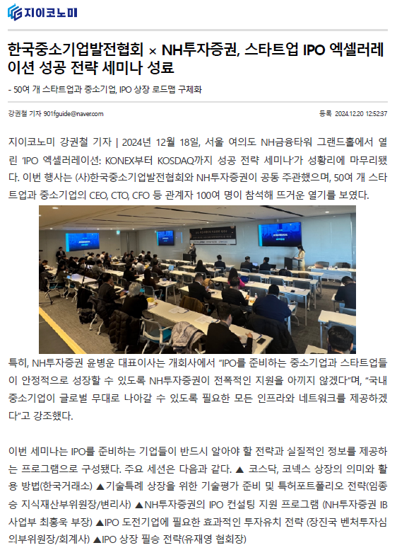 (G.ECONOMY경제/산업)한국중소기업발전협회xNH투자증권,스타트업IPO엑셀러레이션 성공전략 세미나 성료(2024.12.20기사)